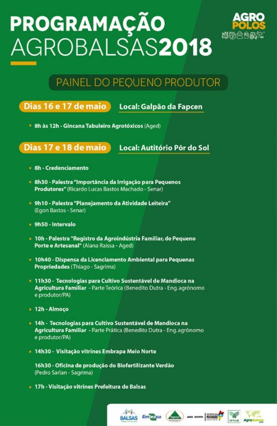 Incluindo a realização de palestras como a ‘Importância de irrigação para pequenos produtores’ e ‘Registro de agroindústria familiar de pequeno porte e artesanal’, o estande da Sagrima também ofertará oficinas como a de ‘Produção do Biofertilizante Verdão’ e ‘Tecnologia para cultivo sustentável de mandioca na Agricultura Familiar’, além de apresentar aos visitantes os resultados de programas como o Mais Produção e o Agropolos.