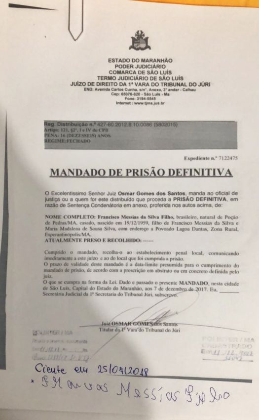 Ele estava foragido desde 2016 após a prática de mais três homicídios ocorridos no dia 17/03/16, nas imediações do Povoado Centro do Meio, na zona rural de Esperantinópolis/MA. Foram cumpridos todos os mandados de prisão exarados em desfavor de Mãozinha. A prisão foi possível em decorrência do esforço conjunto das regionais de Açailândia e Pedreiras que vinham realizando o monitoramento do investigado até conseguirem ter êxito na prisão do mesmo nesta data. O preso foi encaminhado para a unidade prisional de Açailândia onde ficará à disposição do Poder Judiciário.