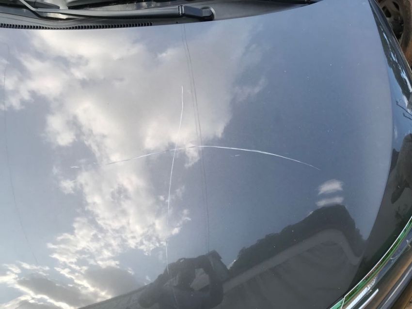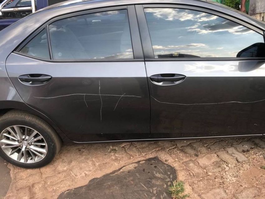 Repare (vídeo) que ele, anda o carro inteiro com um objeto que parece ser um caco de vidro, e aranha toda a lataria do veículo e também para-brisa.