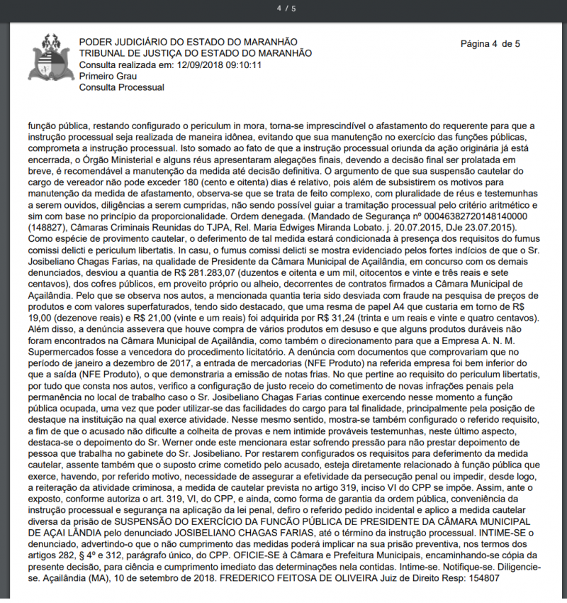 O mesmo Juiz já havia afastado o Presidente no fim da semana passada, em um processo por improbidade administrativa, agora o afasta duplamente, nos autos do processo criminal de numero 1091-79.2018.8.10.0022, ambos os processo foram propostos pelo Ministério Público, atrases da Dra. Glauce Malheiros.