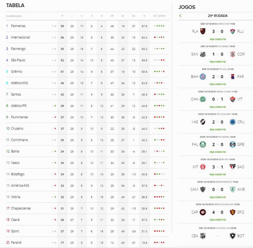 Com dois gols de Deyverson, o Palmeiras venceu o Grêmio por 2 a 0 na tarde deste domingo, no Pacaembu, e se manteve na liderança isolada do Campeonato Brasileiro. A vantagem do Verdão após a 29ª rodada continua sendo de três pontos sobre o Internacional, que venceu o São Paulo por 3 a 1 no Beira-Rio. O Tricolor gaúcho também não saiu do lugar: é o quinto colocado, mas agora a oito pontos do primeiro. CLIQUE AQUI e veja a tabela do Brasileirão.
