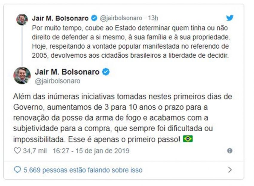 O presidente também lembrou o dispositivo que aumenta para dez anos o prazo para renovação de armas de fogo. “Além das inúmeras iniciativas tomadas nestes primeiros dias de governo, aumentamos de três [e cinco anos] para 10 anos o prazo para a renovação da posse da arma de fogo e acabamos com a subjetividade para a compra, que sempre foi dificultada ou impossibilitada. Esse é apenas o primeiro passo!”.