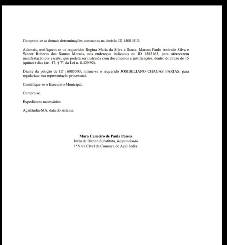 De acordo com a determinação emitida por Mara Carneiro de Paula Pessoa, Juíza de Direito Substituta que Responde a 1ª Vara Cível da Comarca de Açailândia, o afastamento deve ser feito de forma imediata, ainda de acordo com a determinação, a decisão é para os dois mandatos em que Ceará esteve a frente, o que encerrou no final do ano passado e o qual ele foi reeleito mesmo sub júdice.