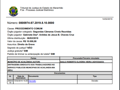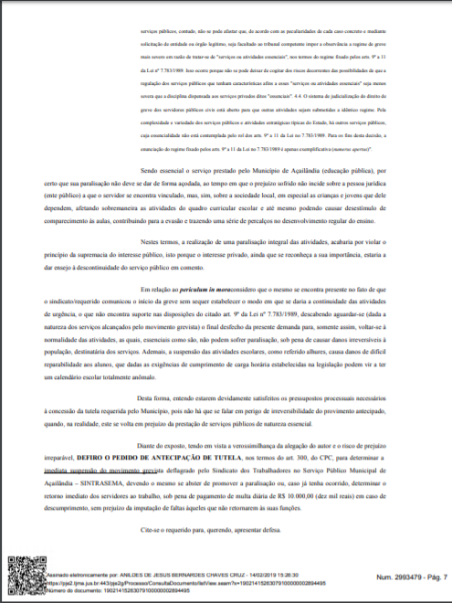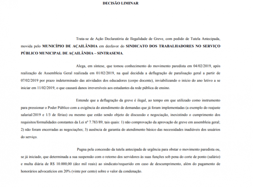 Por fim, a justiça observou o risco de prejuízo irreparável para o alunado açailandense e deferiu o Pedido de Antecipação de Tutela, nos termos do art. 300, do CPC, e determinou a IMEDIATA SUSPENSÃO DO MOVIMENTO GREVISTA deflagrado pelo Sindicato dos Trabalhadores no Serviço Público Municipal de Açailândia – SINTRASEMA, devendo o mesmo se abster de promover a paralisação ou, caso já tenha ocorrido, determinar o retorno imediato dos servidores ao trabalho, sob pena de pagamento de multa diária de R$ 10.000 (dez mil reais) em caso de descumprimento, sem prejuízo da imputação de faltas àqueles que não retornarem às suas funções.