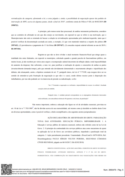Na decisão, a desembargadora cita que sendo um serviço essencial prestado pelo Município de Açailândia, (educação pública), é certo que sua paralisação não deve se dar de forma AÇODADA, ao tempo em que o prejuízo sofrido não incide sobre a pessoa jurídica (ente público) a que o servidor se encontra vinculado, mas, sim, sobre a sociedade local, em especial as crianças e jovens que dele dependem, afetando sobremaneira as atividades do quadro curricular escolar e até mesmo podendo causar desestimulo de comparecimento às aulas, contribuindo para a evasão e trazendo uma série de percalços no desenvolvimento regular do ensino.