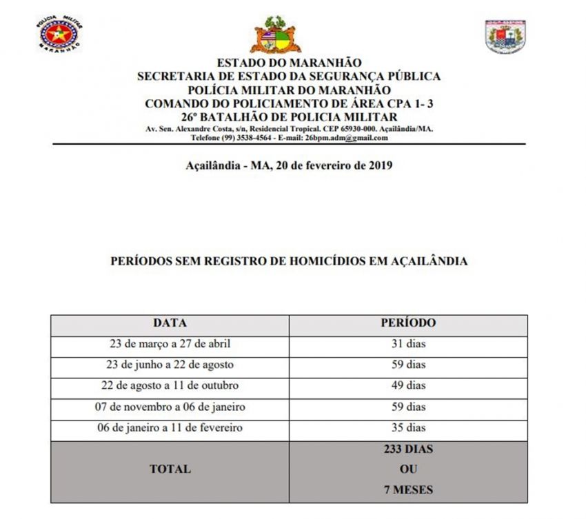 AÇAILÂNDIA – Polícia Militar faz balanço dos dias sem homicídios nos últimos 12 meses: veja os dados