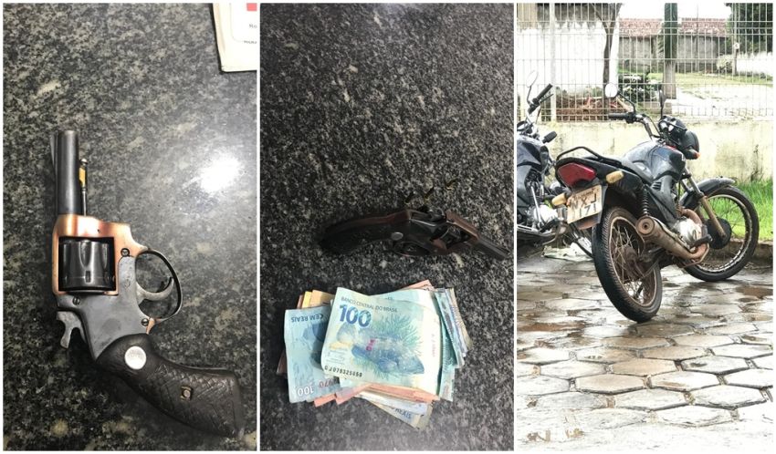 Uma equipe de policiais se deslocava para uma base da PM quando avistou dois elementos em uma Moto Preta em alta velocidade e iniciou um acompanhamento. Os mesmos foram abordados em uma via que liga os bairros: Ouro Verde e Vila Juscelino. Ao fazer uma revista pessoal os conduzidos estavam com uma quantia em dinheiro e um revólver calibre 22, após averiguação foi constatado que se tratava dos mesmo que teria assaltado o posto Pacheco minutos antes. Eles foram identificados como: JONATAS LEMOS CORREIA -21 ANOS e JANDERSON DE SOUSA MOURÃO -19 ANOS