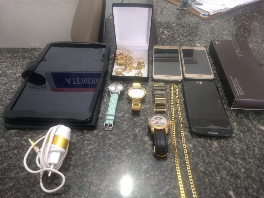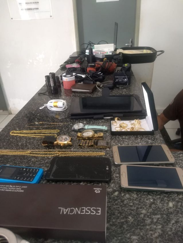 Na residência foram encontrados vários objetos como: celulares, perfumes, facas, máquinas fotográficas, etc. Todos os objetos produtos de furto.