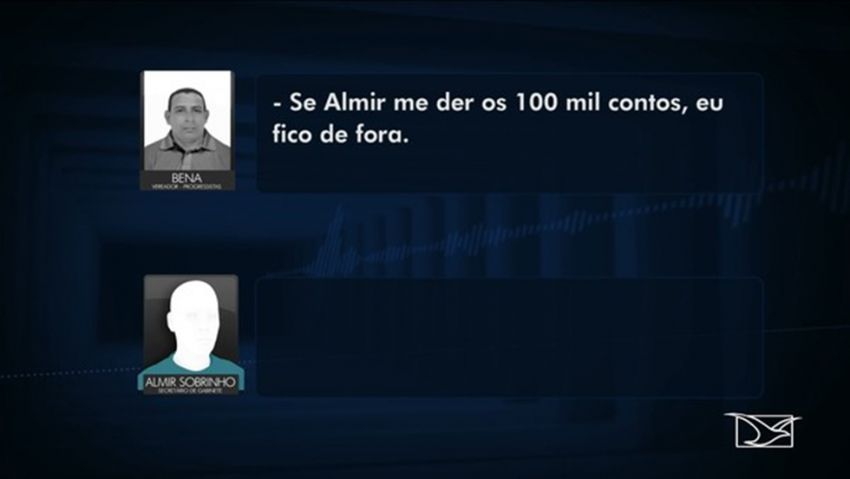 Em uma das vozes, que seria do vereador Bena (Progressistas), há indícios de que ele pede propina ao secretário de gabinete, Almir Sobrinho. Almir é marido da prefeita e gravou e denunciou ao Ministério Público várias reuniões em que os vereadores pediam até R$ 100 mil em dinheiro. Veja a transcrição de um dos áudios.