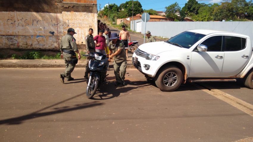 O acidente aconteceu no início da tarde de hoje no Bairro Jardim América no cruzamento das Ruas Safira e Cumaru. Os veículos envolvidos uma pick-up L200 Triton e uma motocicleta Honda biz.