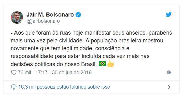 Por meio da rede social Twitter, o presidente Jair Bolsonaro parabenizou os manifestantes. "Aos que foram às ruas hoje manifestar seus anseios, parabéns mais uma vez pela civilidade. A população brasileira mostrou novamente que tem legitimidade, consciência e responsabilidade para estar incluída cada vez mais nas decisões políticas do nosso Brasil", escreveu.