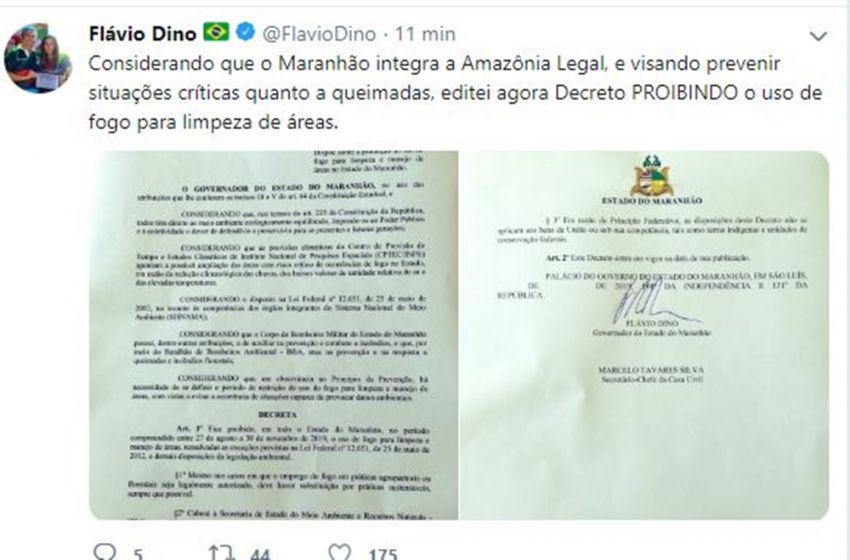 O governador do estado, Flávio Dino, publicou em sua rede social Twitter na tarde desta segunda-feira (26), o decreto que proíbe o uso de fogo para as limpezas de áreas. Fica proibido em todo o estado do Maranhão, no período de 27 de agosto a 30 de novembro de 2019.