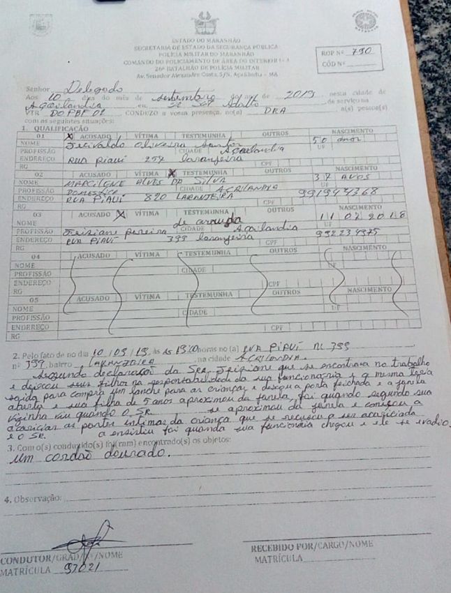 Segundo declarou a vítima, a mesma se encontrava no serviço e quando chegou em casa ontem (10/09) foi informado por sua vizinha, que o seu vizinho identificado como: Gessivaldo de 50 anos, ao passar de frente a sua residência deparou-se com sua filha de 5 anos na janela, logo ele (Gessivaldo) se aproximou da criança e começou a acariciar as partes íntimas da criança. Ao ver a sua funcionária se aproximando, o mesmo ser vadio do local sendo localizado 20 minutos depois na sua residência e conduzido para a delegacia.