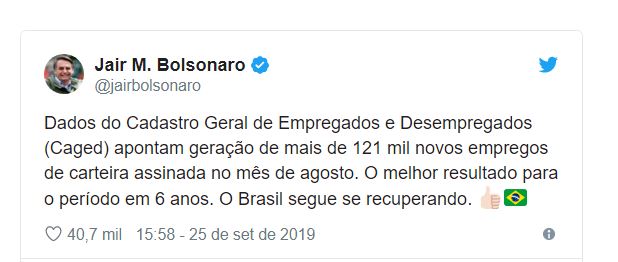 Pelas redes sociais, o presidente Jair Bolsonaro comentou os dados do Caged e disse que "o Brasil segue se recuperando".