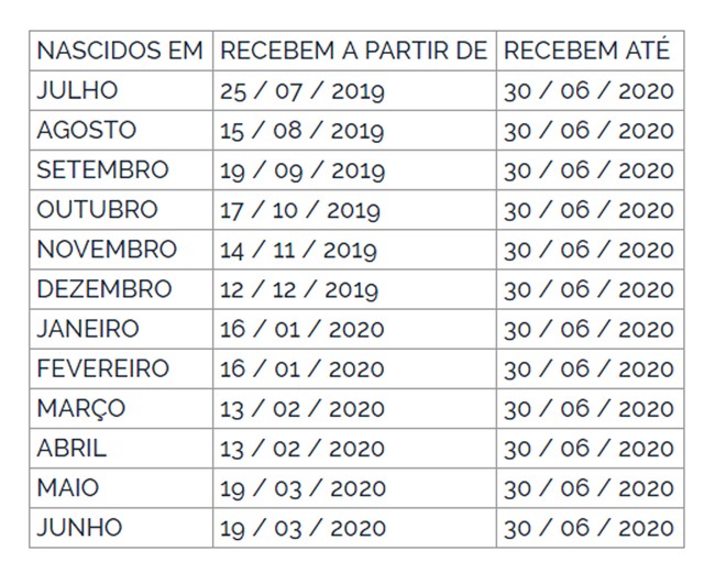 Quem nasceu nos meses de julho a dezembro ou tem número final de inscrição entre 0 e 4 receberá o benefício ainda no ano de 2019. Já os nascidos entre janeiro e junho e com número de inscrição entre 5 e 9 receberão no primeiro trimestre de 2020. Em qualquer situação, o recurso ficará à disposição do trabalhador até 30 de junho de 2020, prazo final para o recebimento.