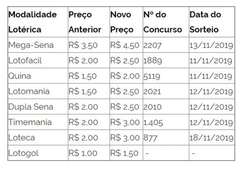 Os novos valores foram autorizados pela Portaria nº 8.061 do Ministério da Economia, publicada no Diário Oficial da União no último dia 31 de outubro. O reajuste valerá para os sorteios que serão realizados a partir desta segunda-feira (11). Os novos preços serão os mesmos em todos os canais de apostas, conforme tabela: