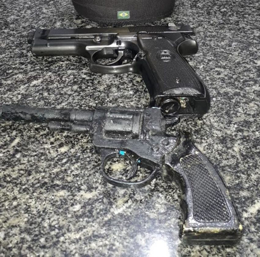 Com o grupo, os Policiais localização dois simulacros de arma de fogo, um calibre .38 e uma pistola KWG, coincidência ou não, ambas as armas estavam em posse dos menores.