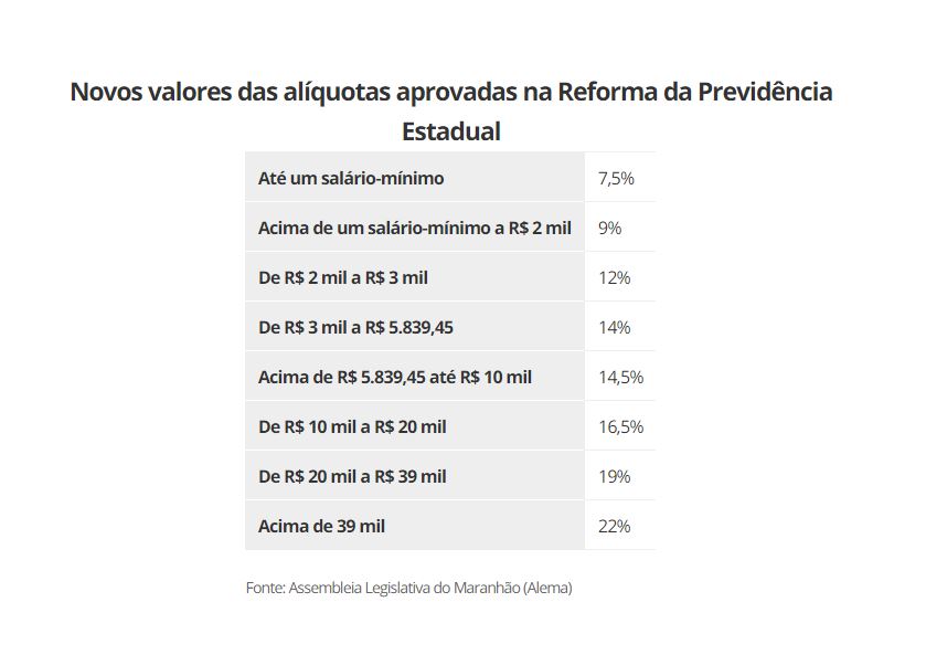 Em média, sobe de 11% para 14% a alíquota de contribuição previdenciária descontadas dos vencimentos. Os descontos em vencimentos de pessoas que recebem um salário-mínimo, por exemplo, será de 7,5%. O desconto pode chegar a 22% e possui variação de acordo com o valor dos salários. Mais de 100 mil pessoas que atuam no funcionalismo público do Maranhão devem ser atingidas pela mudança.