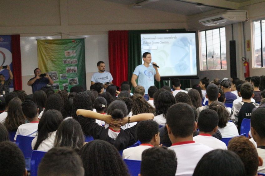 Desta vez, os alunos participaram de uma palestra motivacional com Rodrigo Gonçalves Dias, vencedor do Prêmio Jovem Cientista. O Prêmio Jovem Cientista visa revelar talentos, impulsionar a pesquisa no país e investir em estudantes e jovens pesquisadores que procuram inovar na solução dos desafios da sociedade. O evento aconteceu no auditório da Faculdade Vale do Aço – FAVALE e reuniu mais de 300 alunos adolescentes.