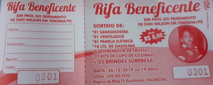 Diante de todo o valor que já foi gasto até aqui, e que será necessário para o andamento do diagnóstico para saber que doença é esta, e do valor necessário para trata-la, estamos realizando uma RIFA BENEFICENTE, para auxiliar no gasto com o menino e a mãe na capital do Piauí.