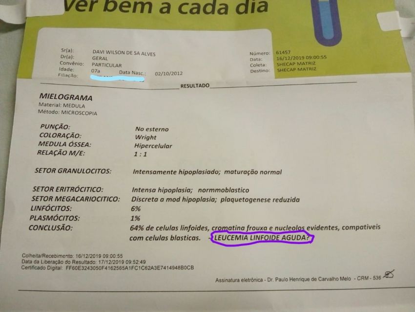 A doença que tanto atormenta o menino Davi enfim foi diagnosticada nesta terça-feira (17), ainda em Teresina, no estado do Piauí, os médicos diagnosticaram que o menino possui um câncer que é mais comum durante a infância, LEUCEMIA LINFOIDE AGUDA.