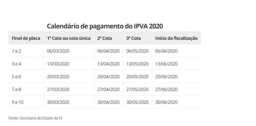 De acordo com a Sefaz, o pagamento do IPVA poderá ser feito em cota única ou parcelado, em até três vezes, conforme a placa do veículo (veja a tabela completa abaixo). Os motoristas que optarem pelo pagamento antecipado em cota única, até 28 de fevereiro, terá 10% de desconto no valor do imposto.