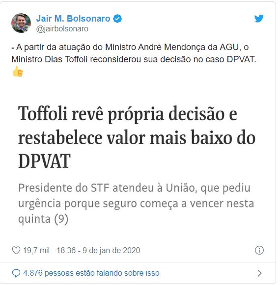 O presidente do Supremo Tribunal Federal (STF), ministro Dias Toffoli, voltou atrás e acolheu pedido do governo para extinguir sua própria liminar que suspendeu a resolução do Conselho Nacional de Seguros Privados (CNSP) que reduziu os valores do seguro obrigatório Dpvat (sigla de Danos Pessoais por Veículos Automotores de Vias Terrestres).