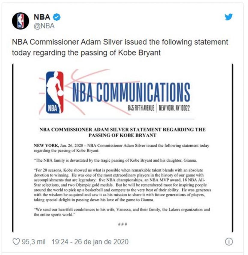 “Mas ele será mais lembrado por inspirar pessoas em todo o mundo a pegar uma bola de basquete e competir no melhor de sua habilidade”, acrescentou Silver em outro trecho da nota. Vários atletas de diferentes esportes já prestam homenagens a Bryant nas redes sociais. Ele é um dos grandes nomes da história da NBA, com cinco títulos conquistados e 33.643 pontos marcados, a quarta maior marca da liga.