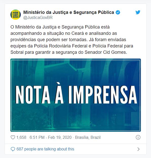 Em nota, também divulgada no Twitter, o Ministério da Justiça e Segurança Pública informou que equipes da Polícia Federal e da Polícia Rodoviária Federal foram enviadas a Sobral para cuidar da segurança do senador. “O Ministério da Justiça e Segurança Pública está acompanhando a situação no Ceará e analisando as providências que podem ser tomadas. Já foram enviadas equipes da Polícia Rodoviária Federal e Polícia Federal para Sobral para garantir a segurança do senador Cid Gomes”.