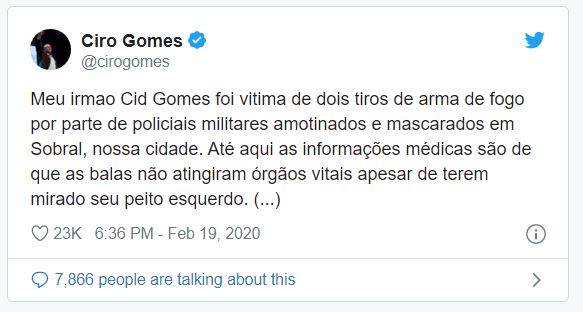 “Meu irmão Cid Gomes foi vítima de dois tiros de arma de fogo por parte de policiais militares amotinados e mascarados em Sobral, nossa cidade. Até aqui as informações médicas são de que as balas não atingiram órgãos vitais apesar de terem mirado seu peito esquerdo”, disse Ciro, pelo Twitter.