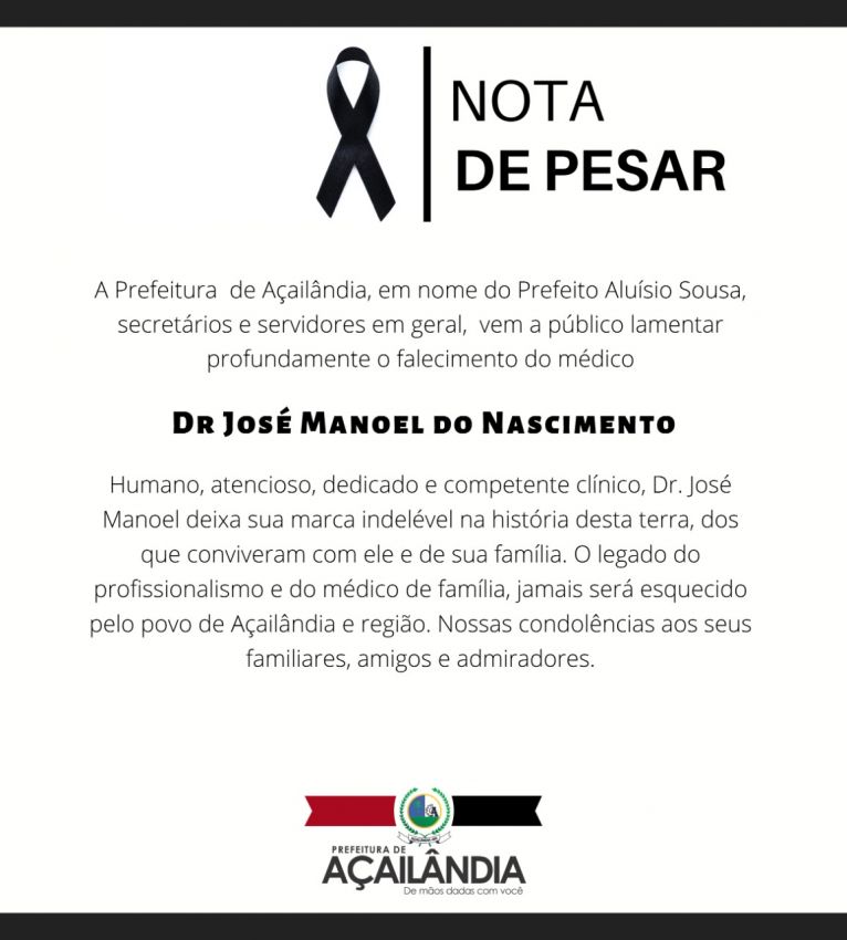 Dr José também era médico de Açailândia e a prefeitura emitiu uma nota lamentado a perda deste grande profissional: veja a nota
