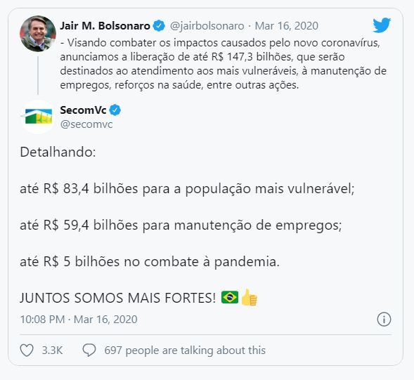 O ministro da Economia, Paulo Guedes, anunciou há pouco que o governo pretende injetar até R$ 147,3 bilhões na economia nos próximos três meses para amenizar o impacto do coronavírus sobre a economia e o sistema de saúde. Segundo o ministro, a maior parte dos recursos vem de remanejamentos, de linhas de crédito e de antecipações de gastos, sem comprometer o espaço fiscal no Orçamento.