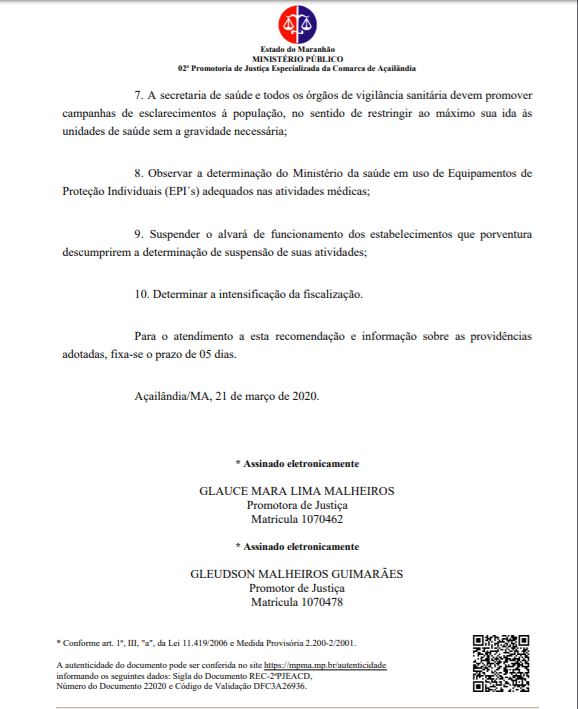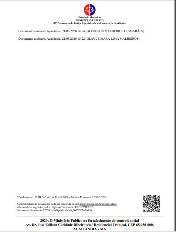 A Promotoria de Justiça de Defesa da Saúde e a Promotoria de Justiça de Defesa do Consumidor expediram RECOMENDAÇÃO aos Srs. Prefeitos Municipais de Açailândia, Cidelândia e São Francisco do Brejão quanto a adoção de medidas de prevenção ao contágio e combate ao risco de transmissão do Covid19 nas respectivas cidades, dentre as quais: