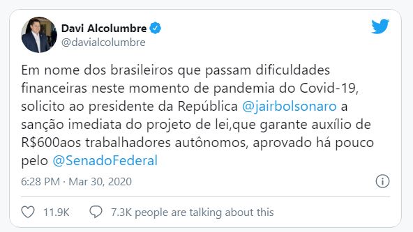 Logo após a aprovação, o presidente do Senado, Davi Alcolumbre, usou o Twitter para pedir ao presidente da República a sanção imediata do projeto. Alcolumbre está afastado de suas atividades após ter sido diagnosticado com o novo coronavírus.