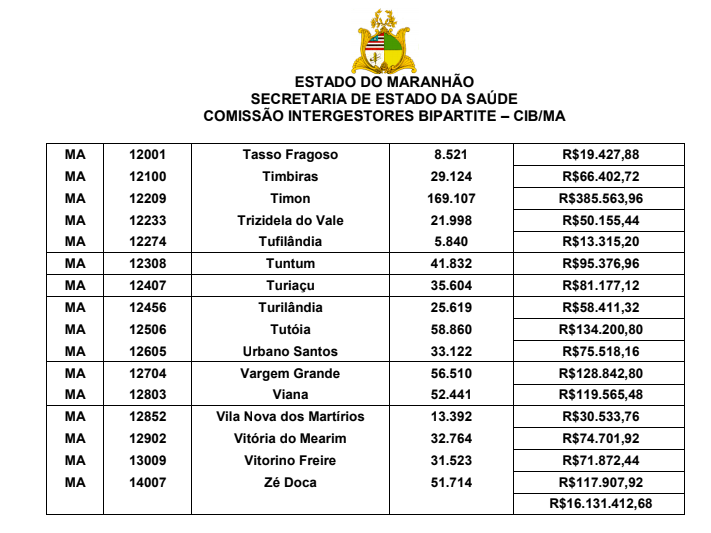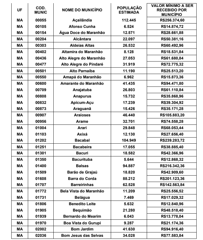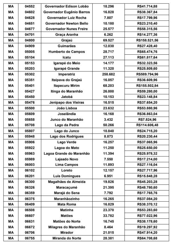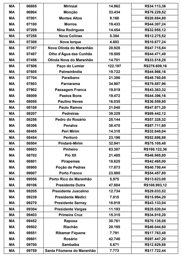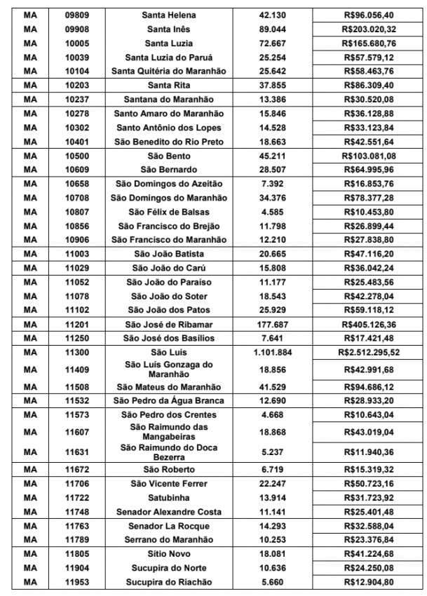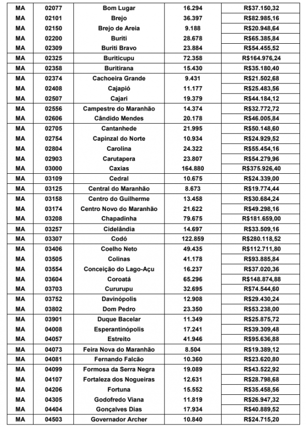 O Maranhão recebeu R$ 20.175.480,46 que serão destinados as prefeituras maranhenses de acordo com o número populacional de cada município.