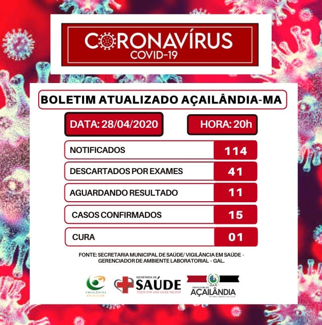 AÇAILÂNDIA URGENTE - Número de casos confirmados de COVID -19 aumentaram de 12 para 15, já os casos notificados pulou de 64 para 114. Veja abaixo o boletim completo