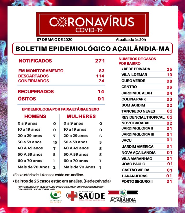 A Secretaria de Saúde informou o novo boletim epidemiológico atualizado na última quinta-feira, dia 07 de Maio em Açailândia. Segundo o formulário, o número de casos confirmados do Novo Coronavírus, aumentou no município, 36 novos casos foram confirmados, comparado ao boletim anterior, elevando o número de 38 para 74 casos.
