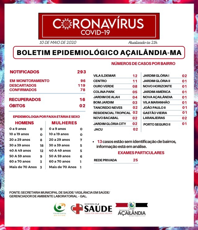 A Secretaria de Saúde informa que neste sábado, (10/05), até às 21h de hoje, temos registrados 293 casos notificados com suspeita clínica e epidemiológica de infecção pelo novo coronavírus.