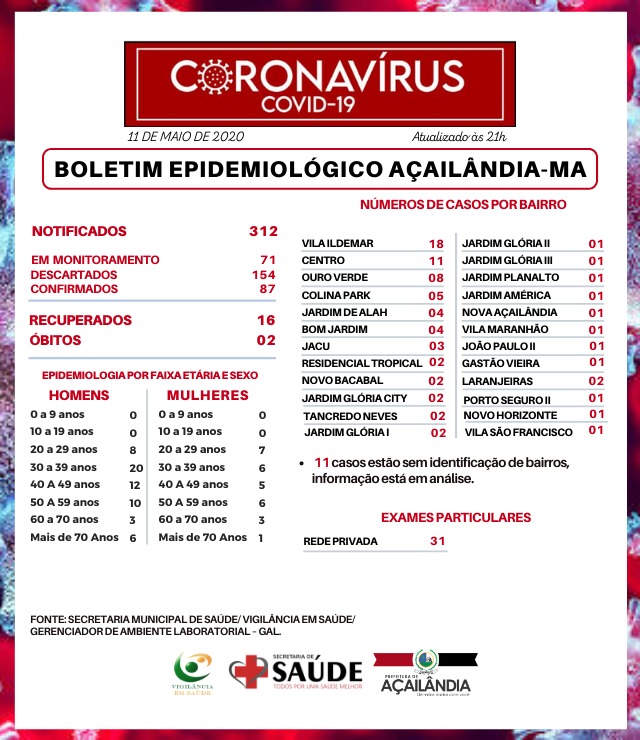 A Secretaria de Saúde informa que na última segunda-feia, (11/05), até às 21h de hoje, temos registrados 312 casos notificados com suspeita clínica e epidemiológica de infecção pelo novo coronavírus.