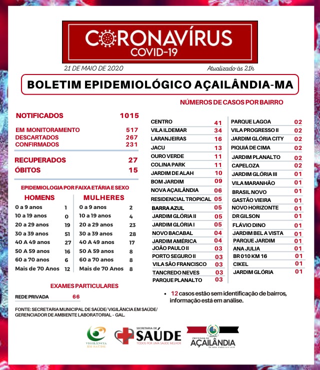 Dos 231 casos confirmados no município, destes, 27 evoluíram para recuperação, e temos 15 óbitos.