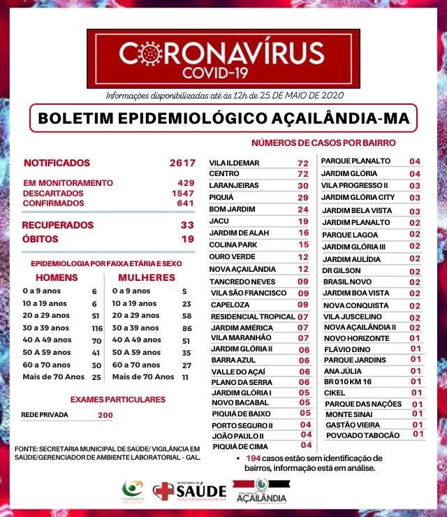 As informações de 194 casos estão sem identificação de bairros, em processamento e em breve estarão no boletim.