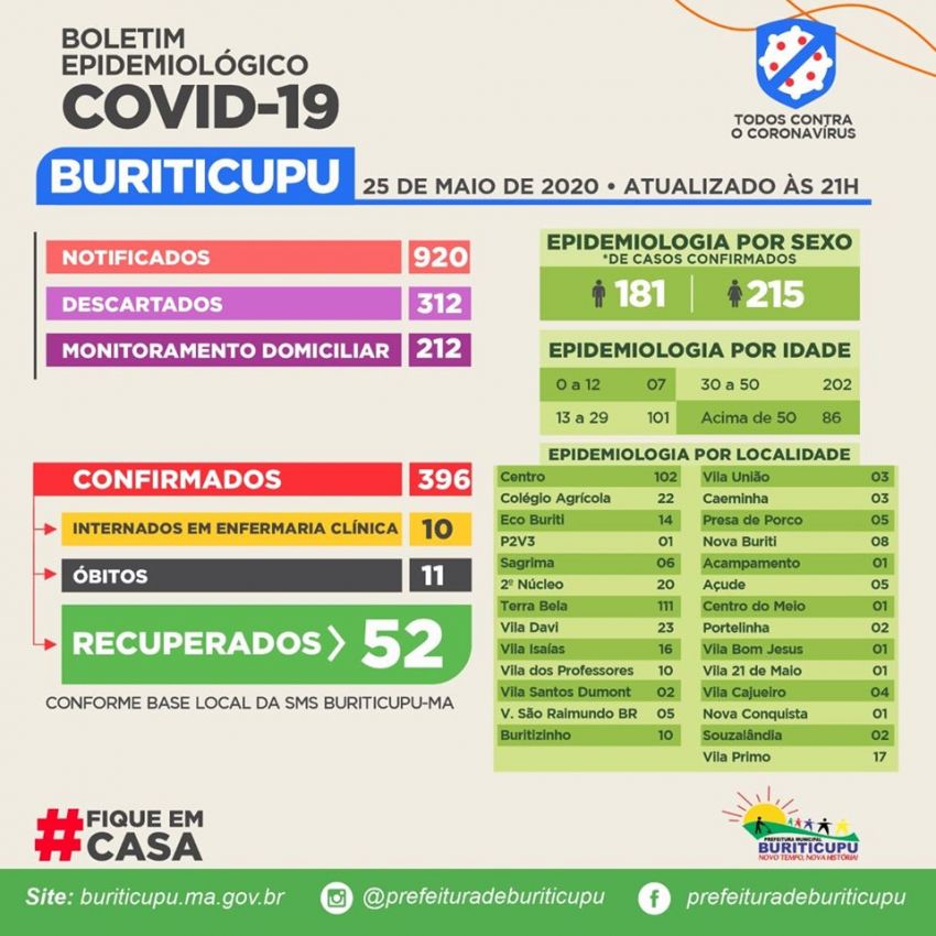 O Boletim de Monitoramento, por meio do Comitê COVID – 19, atualiza na última segunda-feira (25), o quadro de casos notificados do novo coronavírus em Buriticupu. Com o levantamento até às 18h00, estamos com 920 (novecentos e vinte) notificações.