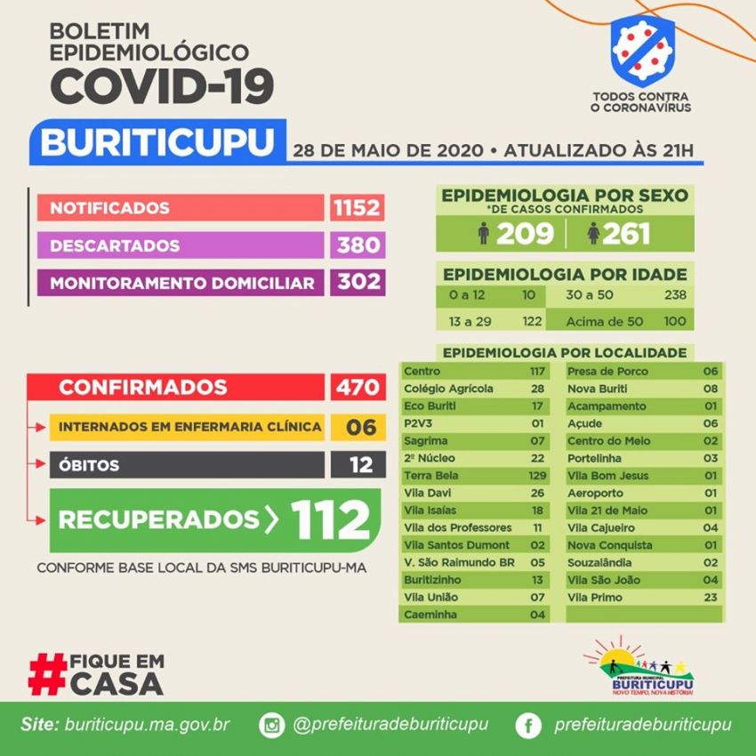 O Boletim de Monitoramento, por meio do Comitê COVID – 19, atualiza na última quinta-feira (28), o quadro de casos notificados do novo coronavírus em Buriticupu. Com o levantamento até às 18h00, estamos com 1152 notificações.