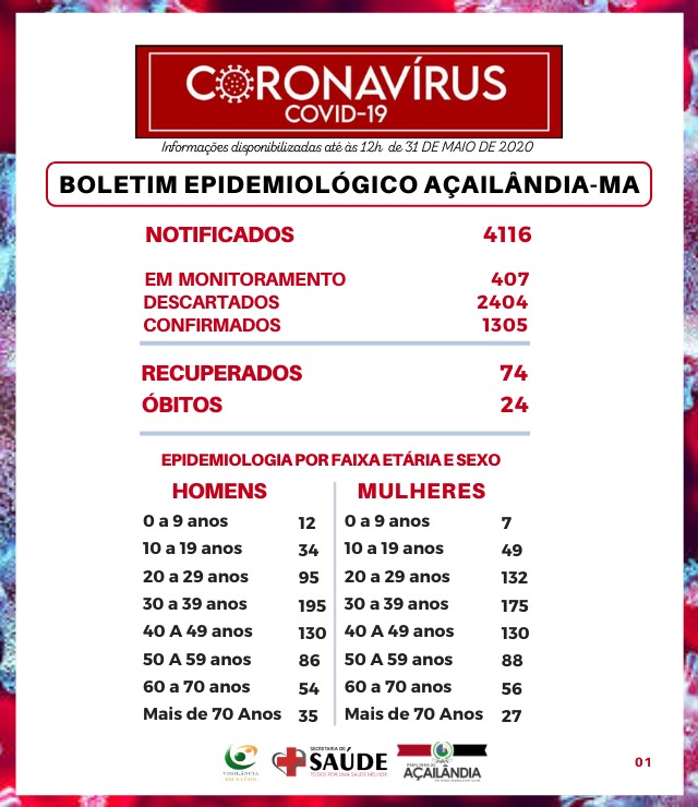 A Secretaria de Saúde informa domingo 31/05, até às 12h, tem-se o número de 4116 casos notificados com suspeita clínica e epidemiológica de infecção pelo novo coronavírus.