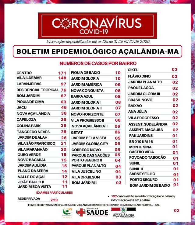 As informações de 192 casos estão sem identificação de bairros, em processamento e em breve estarão no boletim.