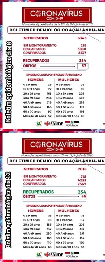 No Boletim epidemiológico divulgado pela secretária de saúde no último dia 08/06, Açailândia registrava 37 óbitos pelo COVID 19, já na sexta-feira 12/06 o número de vítimas era de 46. No Boletim epidemiológico divulgado na última segunda-feira 15/06, o número de pessoas mortas pelo vírus Chinês, subiu para 10 em apenas 8 dias.