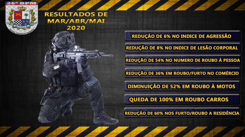 O 26° Batalhão de Polícia Militar de Açailândia divulgou nesta quinta-feira, 18 de junho, o balanço das principais ocorrências durante março a maio deste ano. Segundo o levantamento, em comparação com o mesmo período do ano passado, foi constatado que houve uma queda de 60% nos casos de roubo e furtos a residência. Redução de 100% em roubo de carros. Diminuição de 52% em roubo a motos. Redução de 36% em roubo e furto a comércio, 54% no número de roubo à pessoa, redução de 8% no índice de lesão corporal e redução de 6% no índice de agressão.