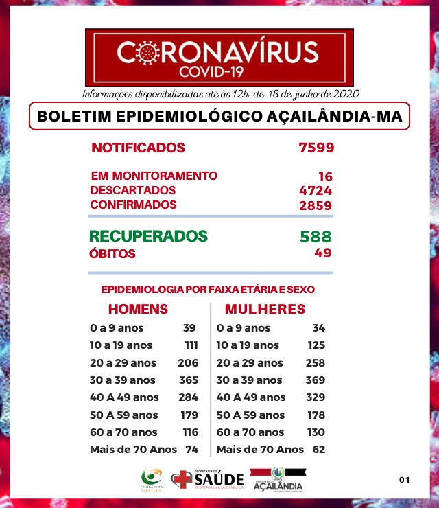 Dos 2859 casos confirmados no município, destes, 588 recuperados; 2222 ativos; e temos 49 óbitos.