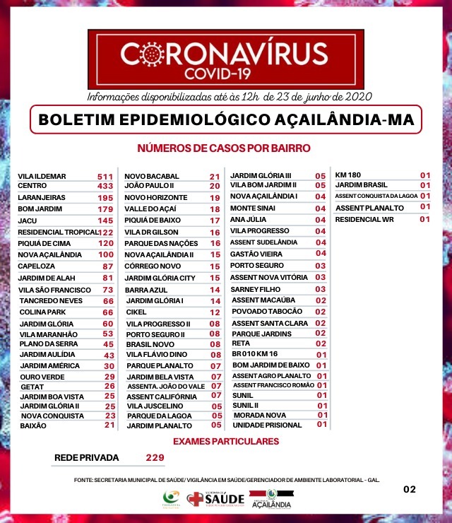 Devido a grande demanda de casos, a Secretaria de Estado de Saúde não está atualizando os dados de Açailândia.