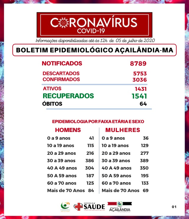 A Secretaria de Saúde informa domingo, 05/07, até às 12h, tem-se o número de 8789 casos notificados com suspeita clínica e epidemiológica de infecção pelo novo coronavírus.